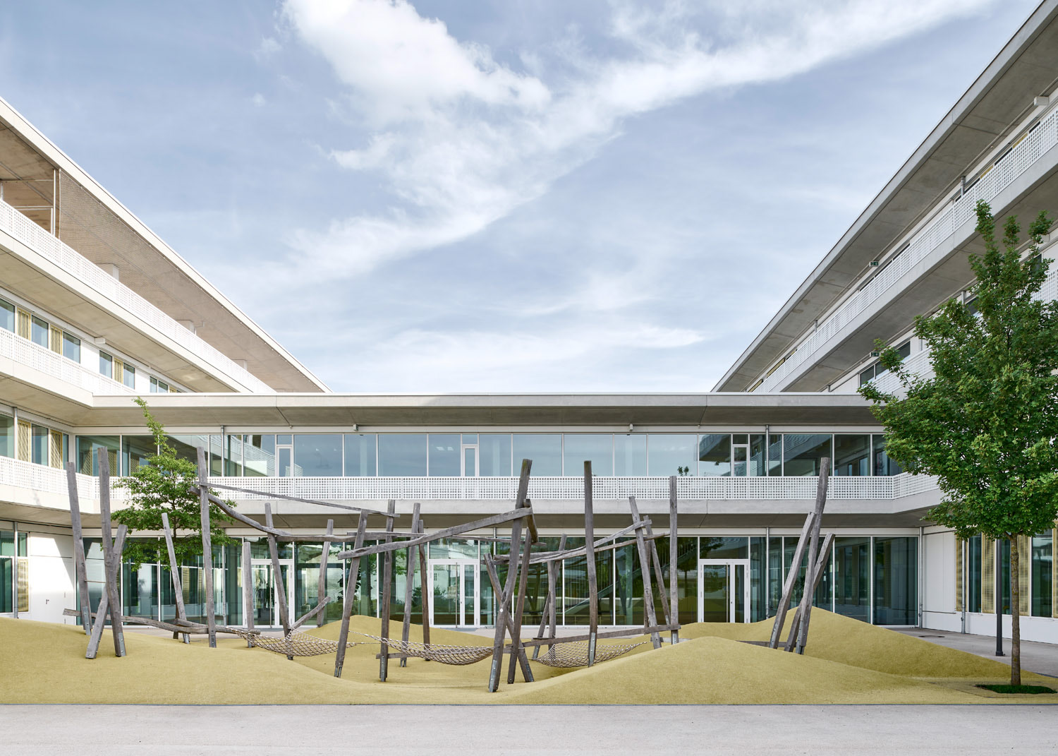 Der Bildungscampus Freiham in München, entworfen von Schürmann Dettinger Architekten und Auer Weber, ist das größte Schulbauprojekt der Stadt. Fertiggestellt 2019, umfasst er Grundschule, Förderzentrum, Realschule und Gymnasium, zentral verbunden durch eine Mensa, Bibliothek und Sporthalle. Die Architektur folgt dem "Münchner Lernhausmodell", das große Einheiten in kleinere Lernhäuser gliedert. Glasfassaden öffnen die Gebäude zur parkähnlichen Landschaft, während lärmbelastete Bereiche abgeschirmt werden. Der Campus integriert Funktionalität, Nachhaltigkeit und ästhetische Gestaltung und fördert Gemeinschaft durch flexible Nutzungsräume und ein harmonisches Zusammenspiel mit der Umgebung.
